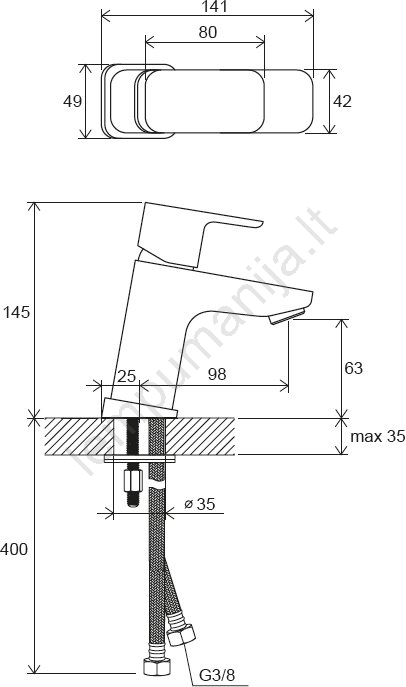• Maišytuvas tiekiamas be išleidimo komplekto ir tinkamas ne tik 10° serijos praustuvams, bet ir daugumai kitų praustuvų.