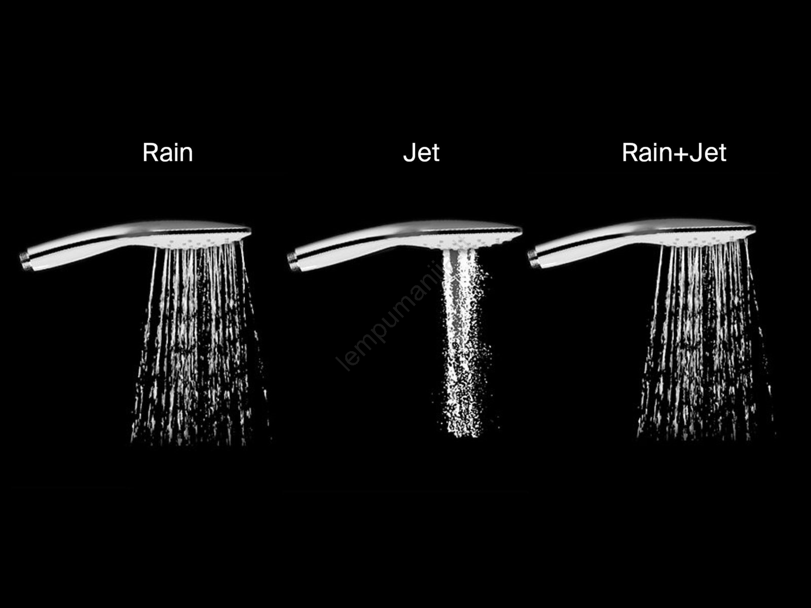 • Rankinis dušas turi tris režimus – švelnų Rain, stiprų Jet ir jų kombinaciją – o dušo galvutę ir laikiklį galima lengvai pasukti norimu kampu.