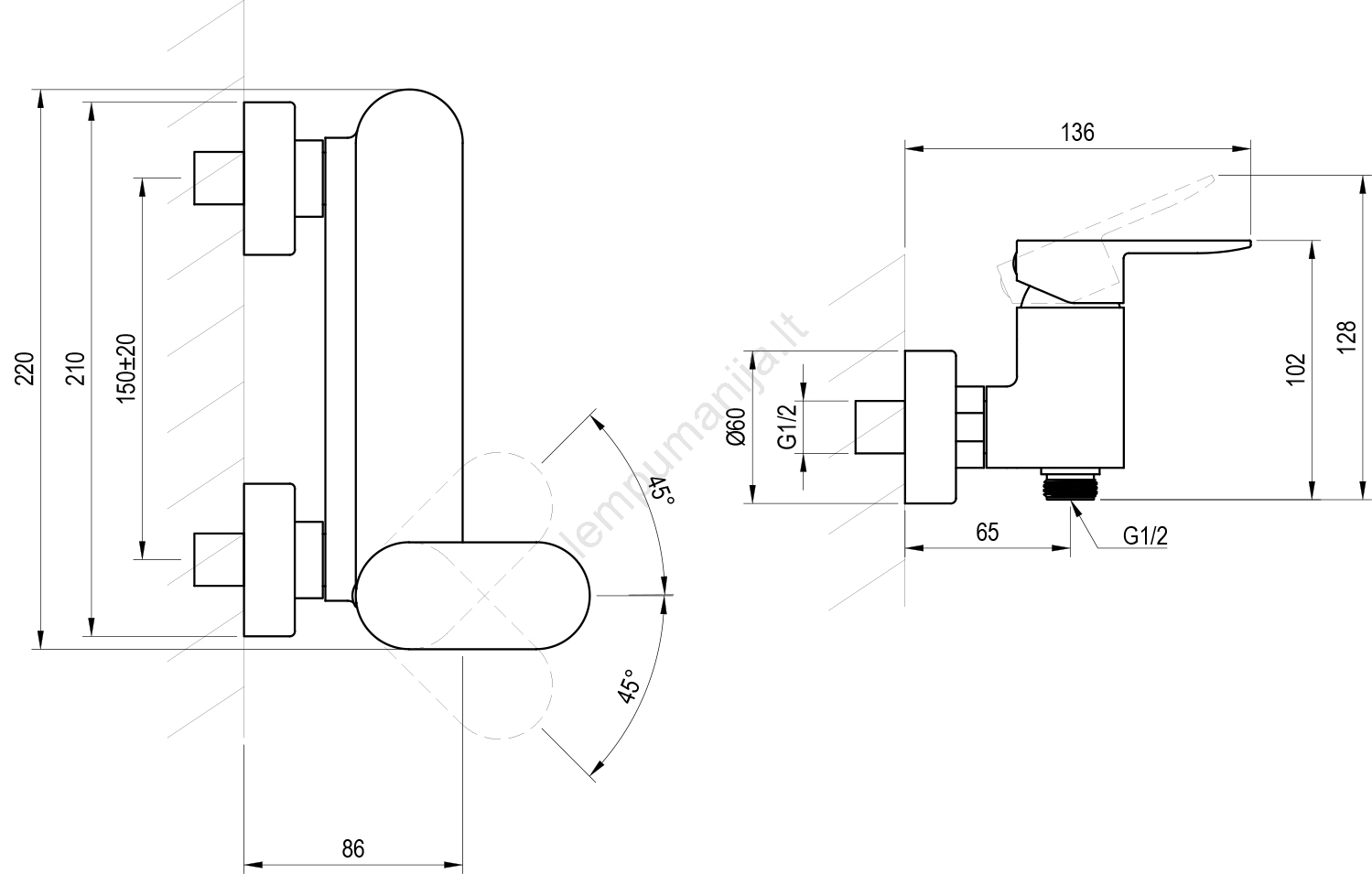 • Maišytuvo montavimo atstumas 150 mm, atitinka standartinius vandentiekio išvedimus.