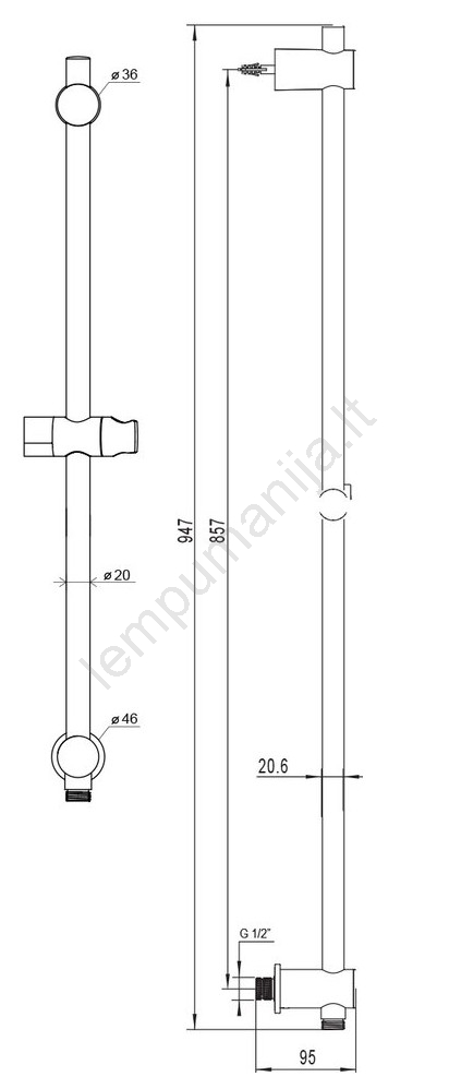 • Įleidžiamasis vandens išvadas tiesiai stiebe su G1/2" išoriniu sriegiu.