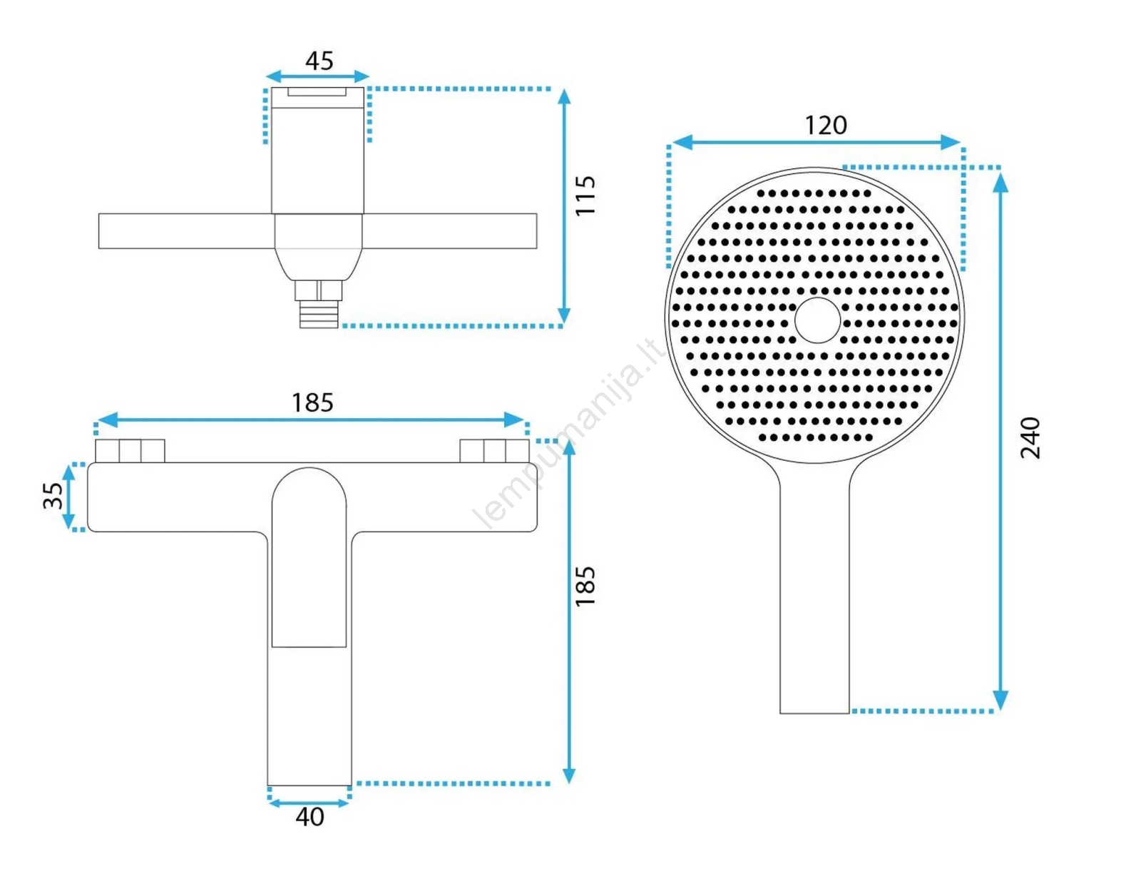 • Komplekte: vonios maišytuvas, rankinė dušo galvutė, dušo žarna (120 mm), rankinės dušo laikiklis.