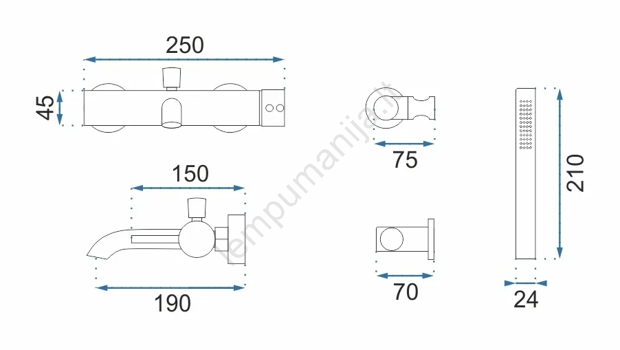 • Rinkinį sudaro: vonios maišytuvas, rankinė dušo galvutė, dušo žarna (190 mm), rankinio dušo laikiklis.