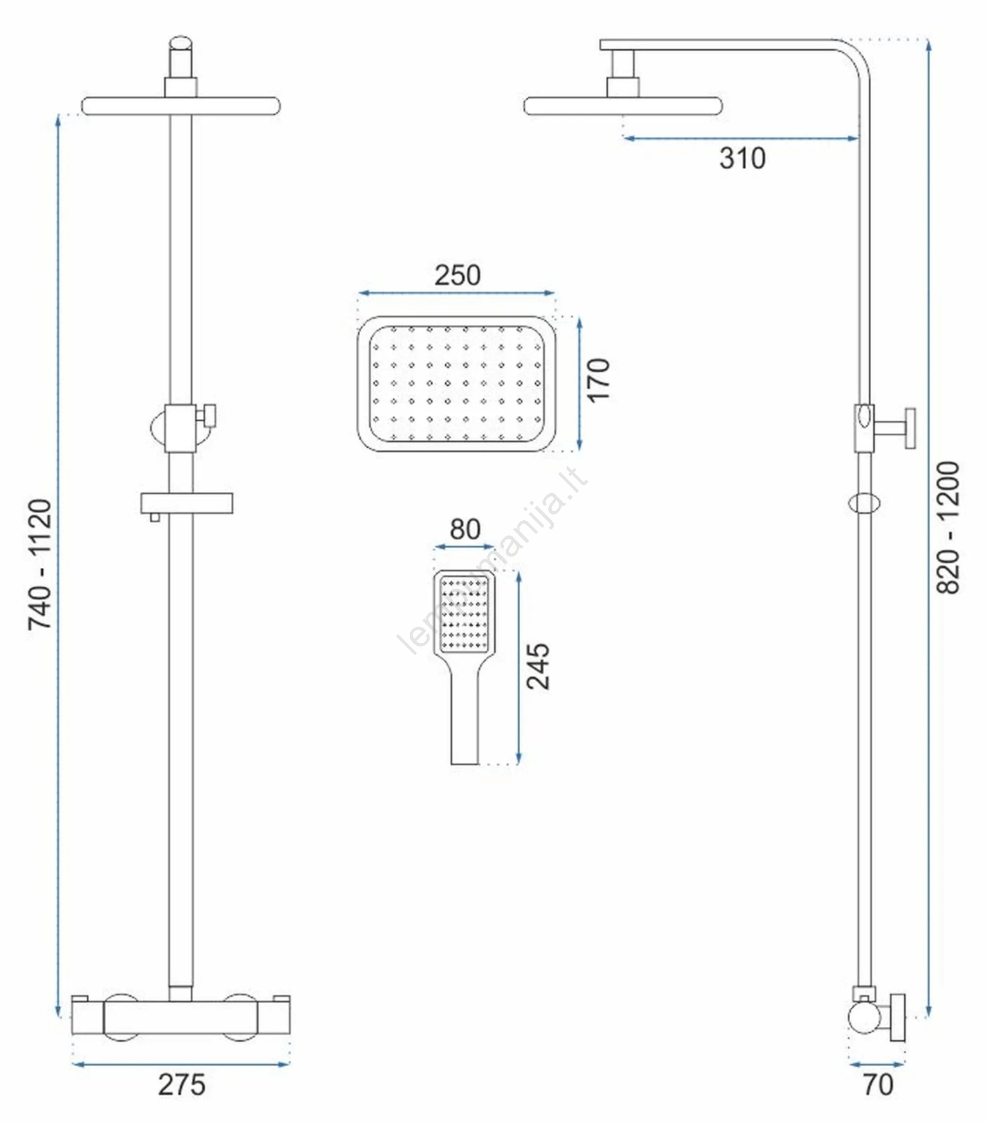 • Dušo strypo reguliavimo diapazonas: 82 - 120 cm.