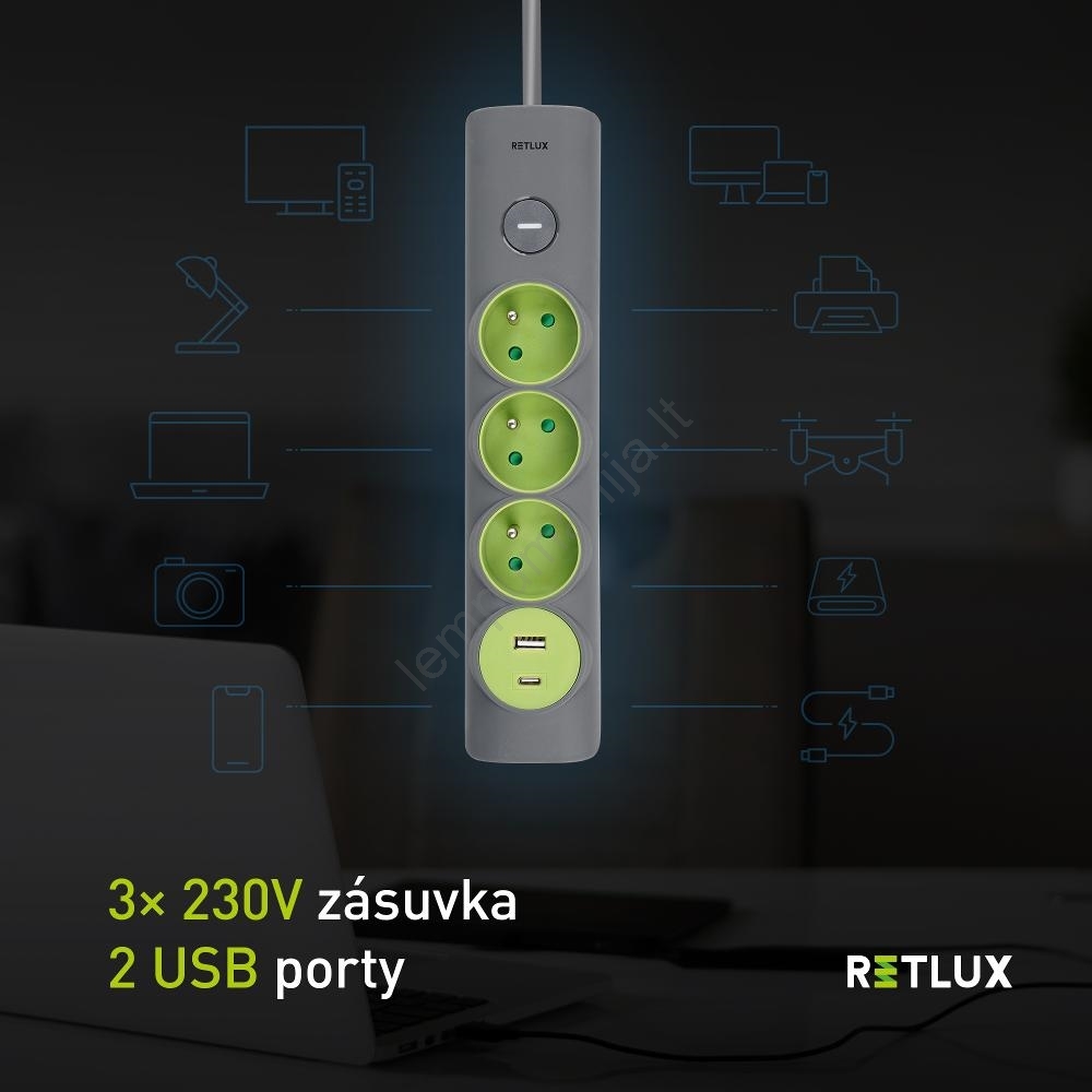 Retlux - 3 lizdų ilgiklis su jungikliu, Tipo E + 1xUSB-A + 1xUSB-C, 1,4 m, pilkas | Lempumanija