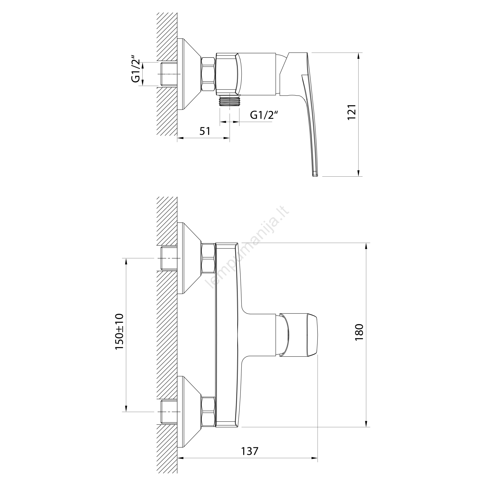 • Sieninis dušo maišytuvas pagamintas iš žalvario.
