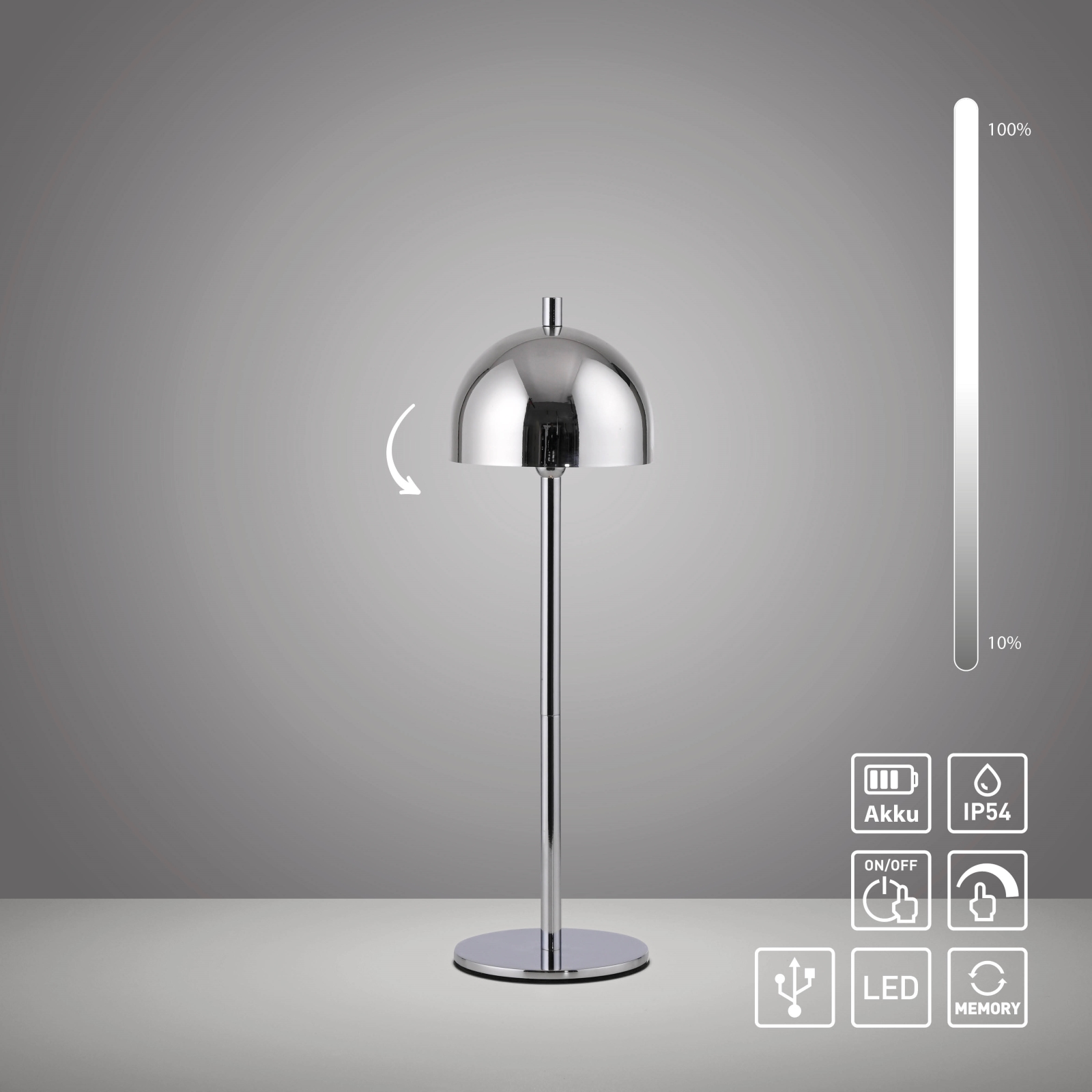 • Schöner Wohnen 19244-17 - LED su reguliuojamu ryškumu jutiklinė įkraunama lauko stalo lempa BELLIS LED/2,5W/5V 2600 mAh IP54 blizgus chromas