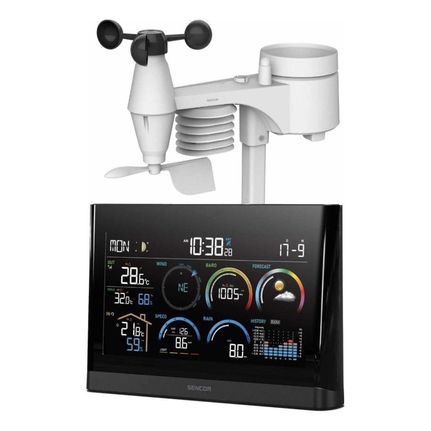 Sencor - Profesionali meteorologinė stotelė su spalvotu LCD ekranu ir žadintuvu 5V/3xAAA + 3xAA