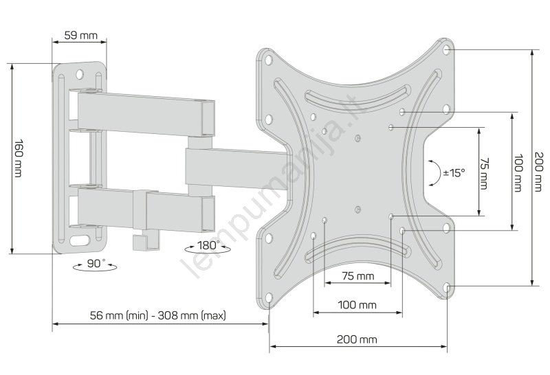 • Atstumas nuo sienos iki televizoriaus: 56 - 308 mm.
