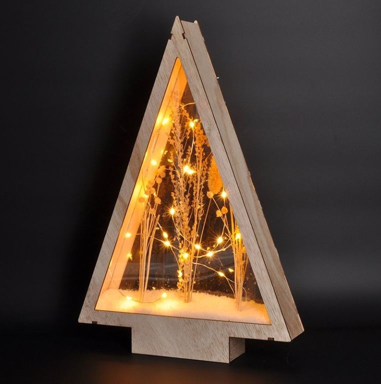 • Natūrali medinė kalėdinė dekoracija, suformuota kaip kalėdinė eglutė, puošta snieguotais žiemos žiedais.