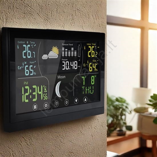• Meteostotis siūlo spalvotą VA ekraną su jutikliniu valdymu, dydžio 168 × 93 mm, užtikrinantį puikų skaitomumą ir intuityvų valdymą.