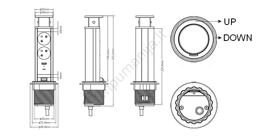 • Maitinimo stulpelis (2x elektros lizdas ir 2x USB) tinkamas stalviršiams, stalams, taip pat virtuvėms ir baldams - ten, kur reikia elektros lizdų.