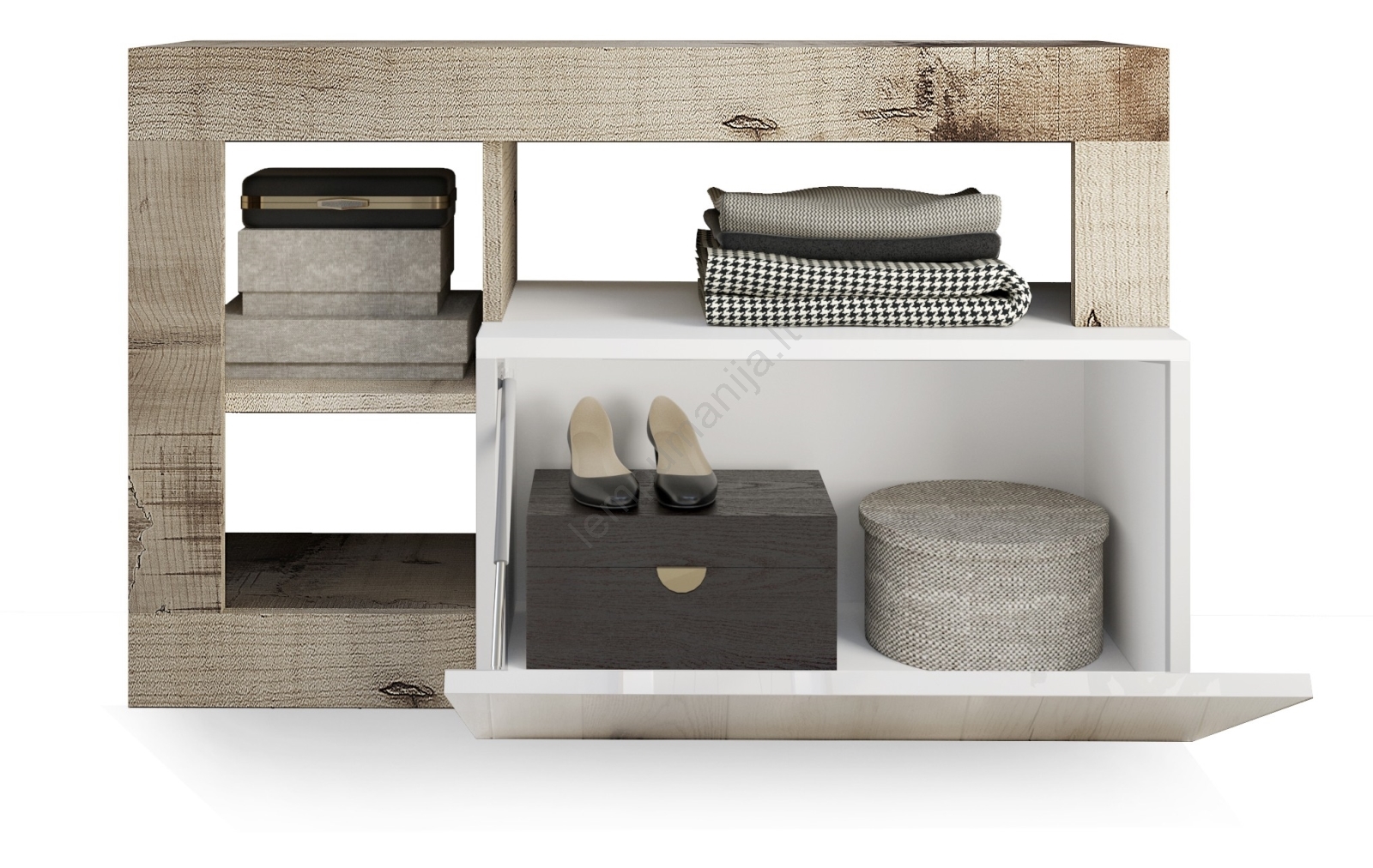 • Turi 3 atviras lentynas ir vidinę lentyną su pakeliamo dangčio funkcija daiktų, pavyzdžiui krepšių, batų ir sezoninių daiktų, laikymui.