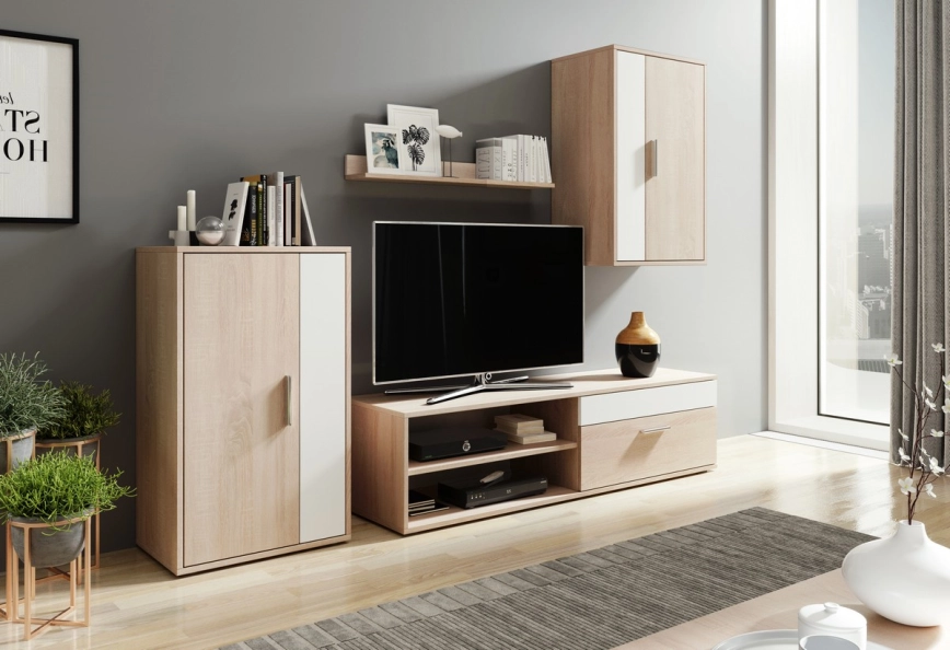 • Sieninė spintelė ir aukšta šoninė spintelė siūlo papildomą vietą knygoms, dekoracijoms ir buities reikmenims.