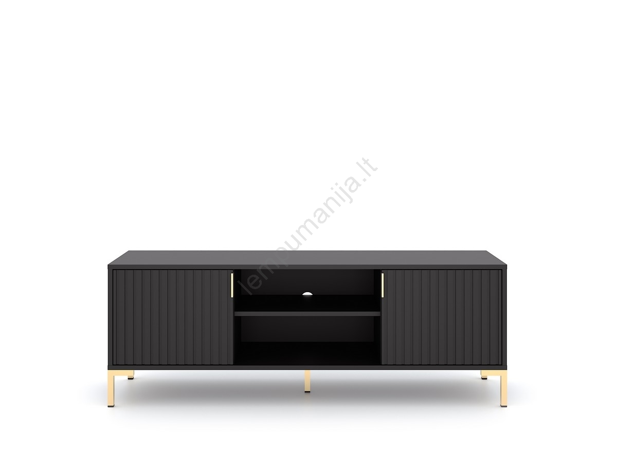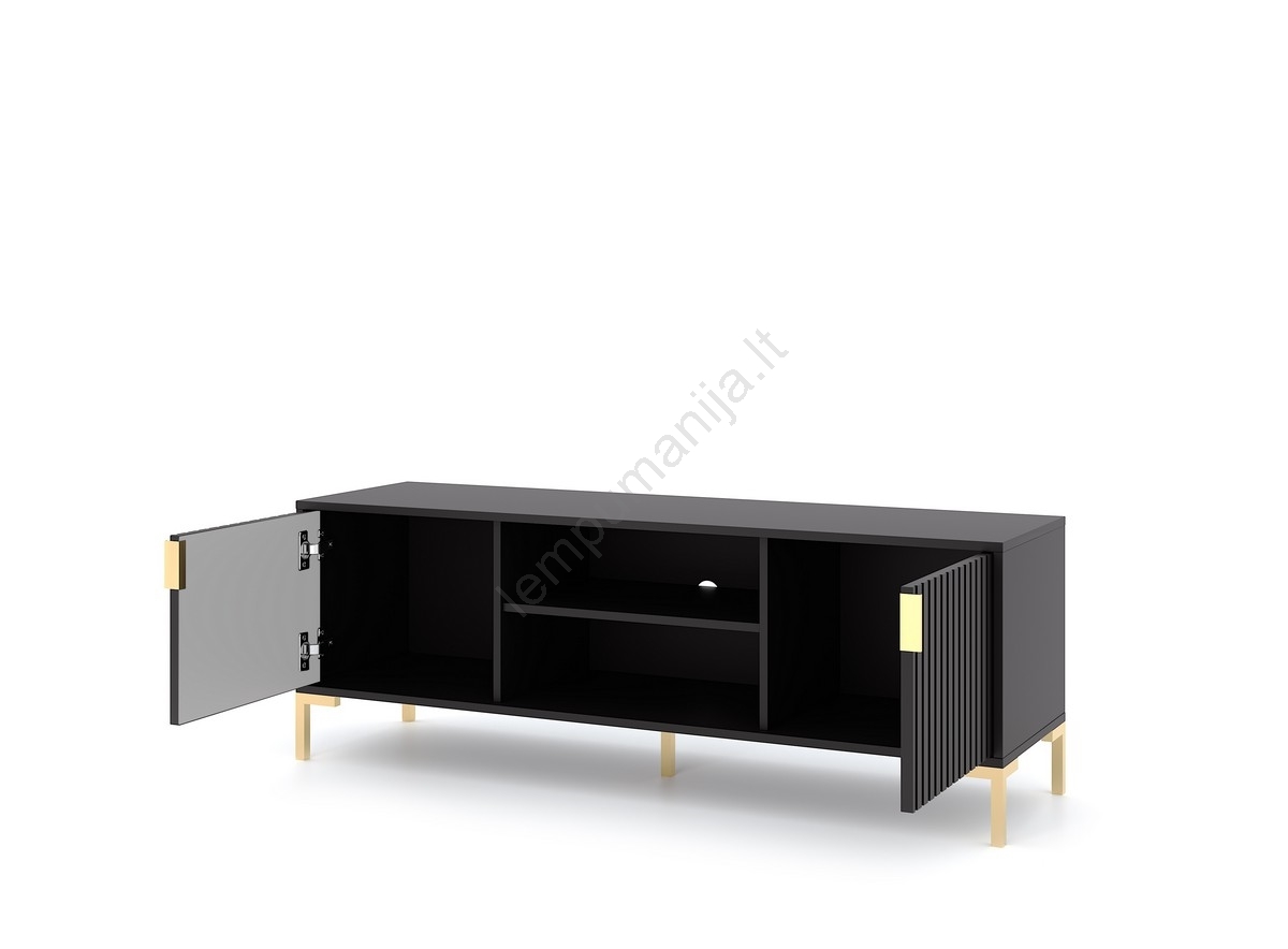 • Jame yra dvi uždaros šoninės spintelės su durelėmis ir simetriškomis rankenėlėmis bei lamelėmis, ir dvi atviros lentynos su kabelio anga centre.