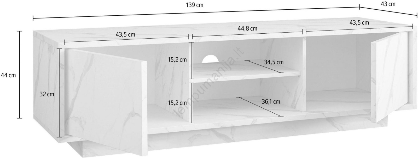 • Apatinės talpyklos ir atviros lentynos suteikia vietos knygoms, dekoracijoms ir namų reikmenims.