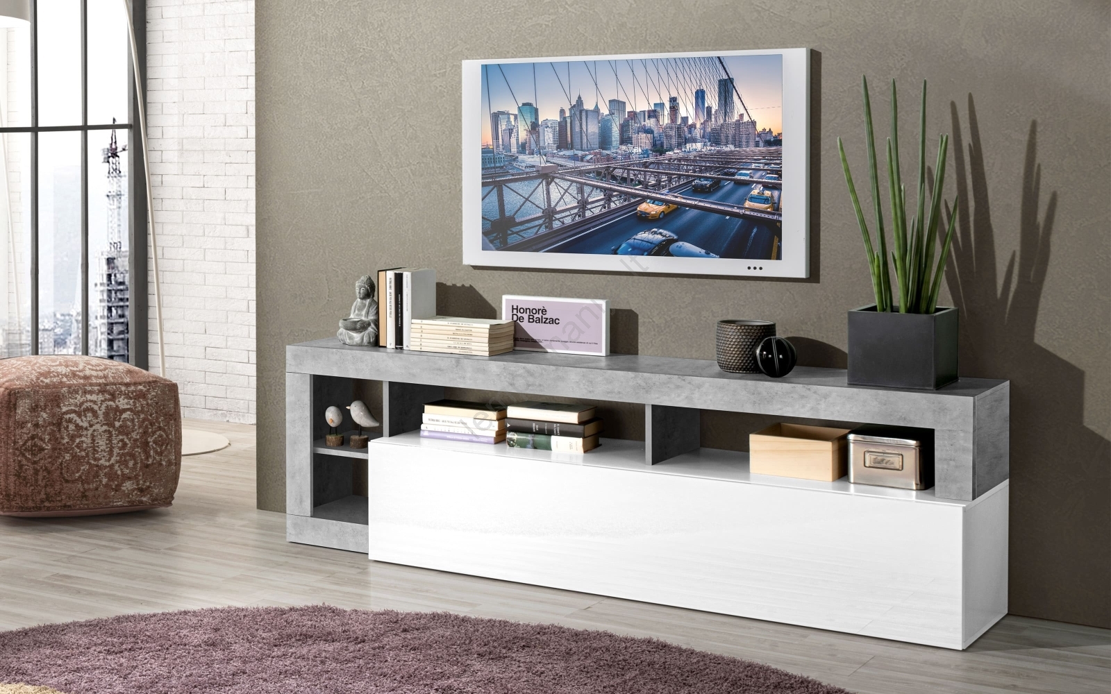• Televizoriaus staliukas LENOR baltas/pilkas, betono efektas