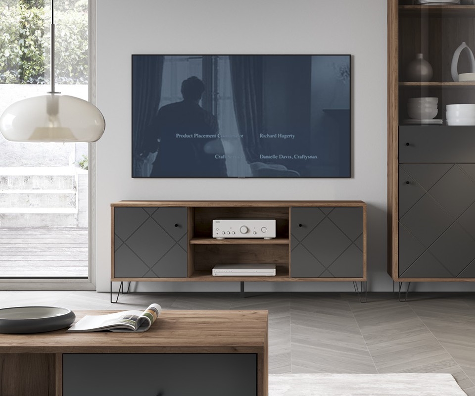 • Dėl ilgo stačiakampio silueto jis puikiai tinka po ant sienos kabinamu televizoriumi arba kaip modernus laikymo sprendimas svetainėje.