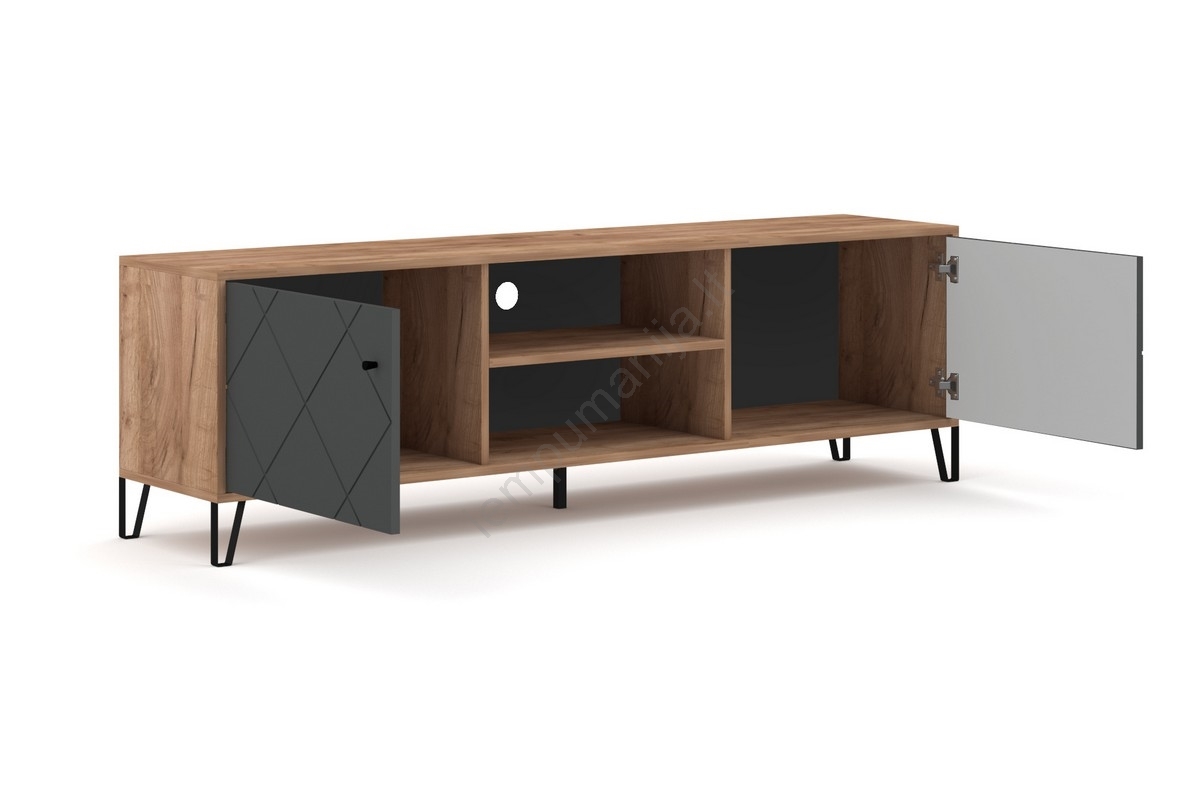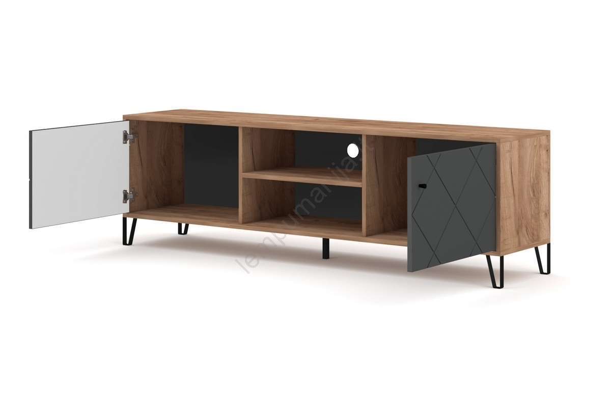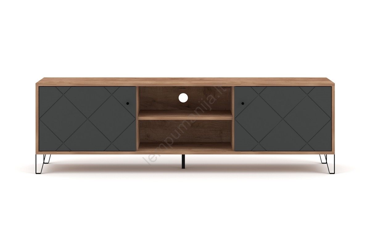 • Jame yra dvi uždaros šoninės talpyklos, kiekviena su durelėmis, puoštomis dekoratyviniu įstrižiniu raštu, ir dvi atviros lentynos su kabelio anga centre.