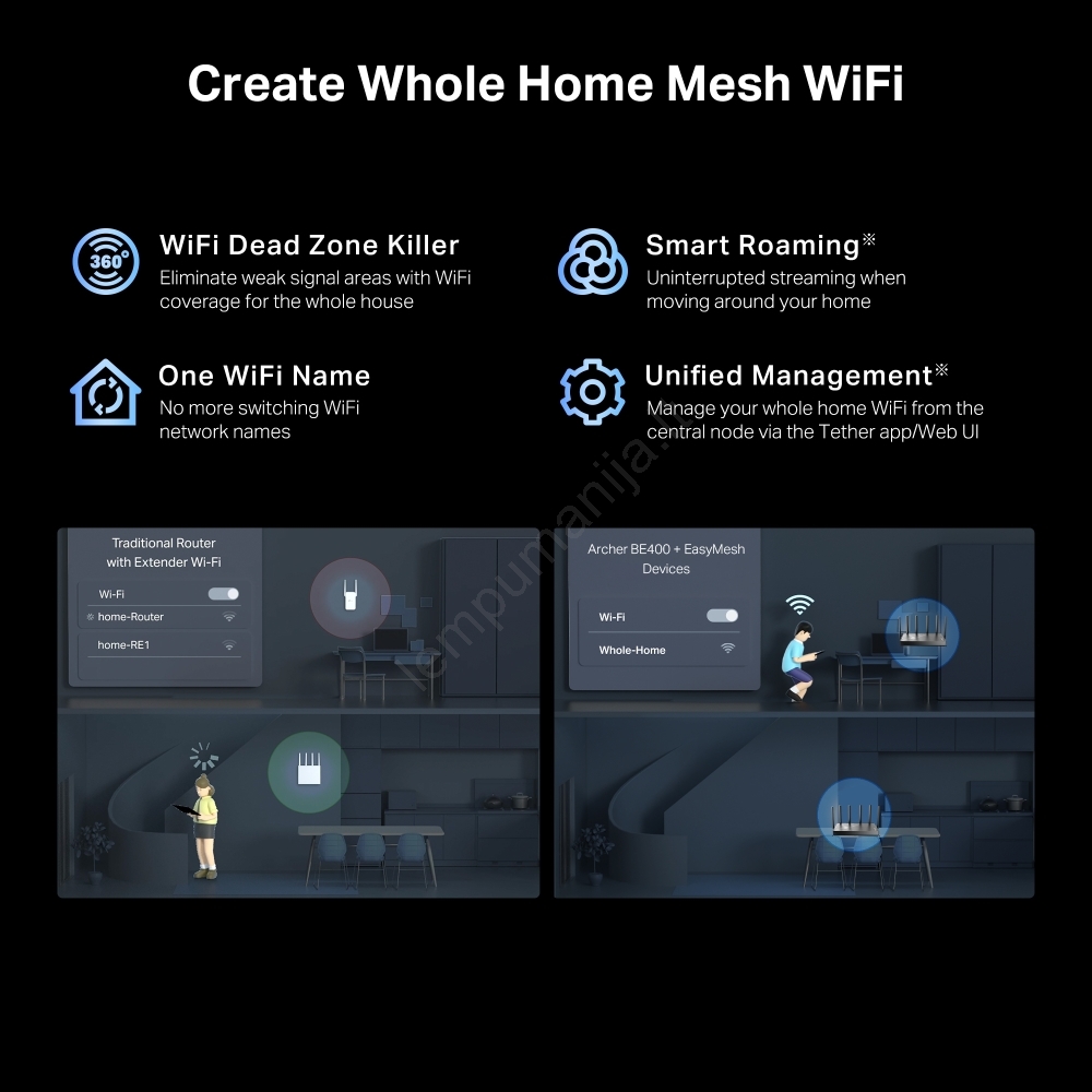 • Tinklo valdymas per programėlę TP-Link Tether užtikrina patogų nustatymą ir stebėseną.