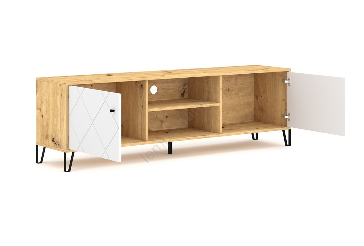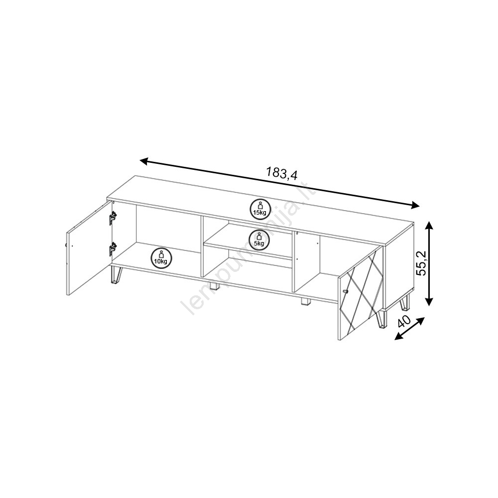 • Turi dvi uždaras šonines spinteles, kiekviena su durelėmis ir įstrižiniu dekoru, bei dvi atviras lentynas su anga laidui centre.