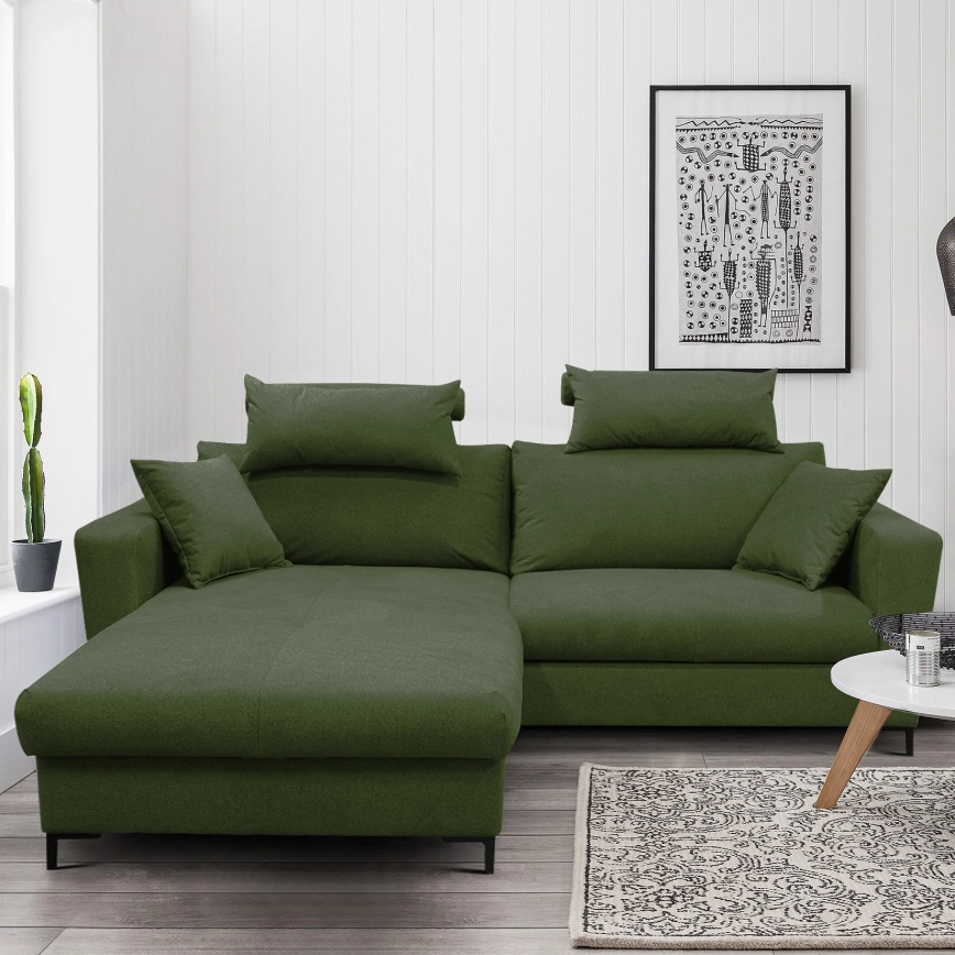 Išskleidžiama L formos kampinė sofa HORTA, kairinė, žalia, su patalynės dėže | Lempumanija