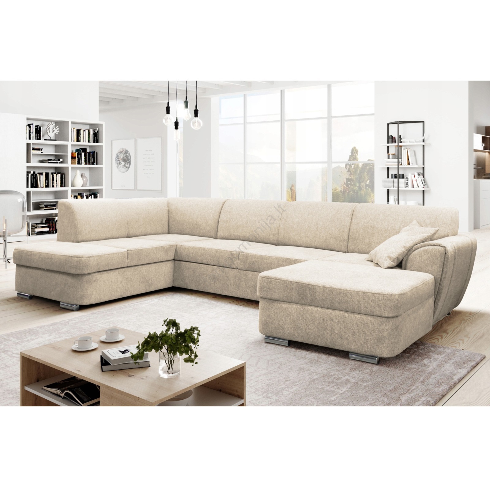 Išskleidžiama kairinė U formos kampinė sofa SERPA su talpia daiktadėže, smėlio spalvos | Lempumanija