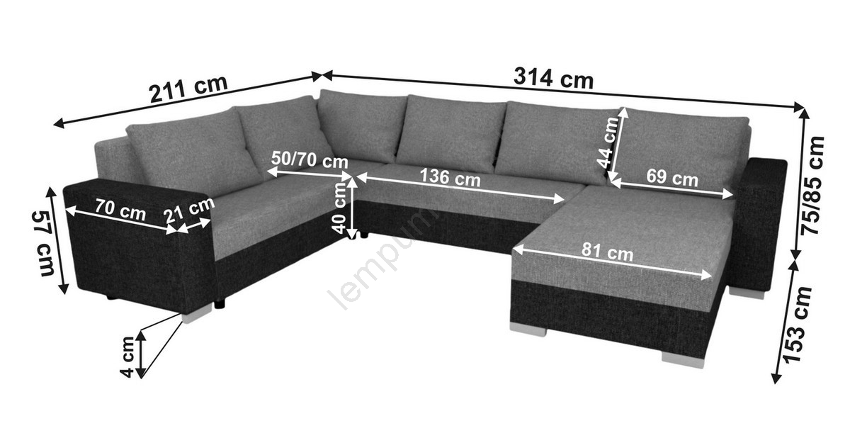 Apmušta universali U formos išskleidžiama sofa YORK juoda/antracitas | Lempumanija