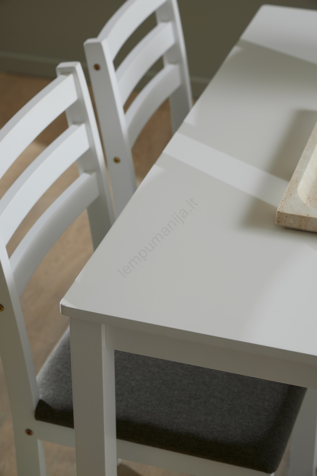 • Sudaro stačiakampis valgomojo stalas ir 4 derančios kėdės su paminkštintomis šviesiai pilkomis sėdynėmis; visas komplektas pagamintas iš masyvios medienos su balta apdaila.