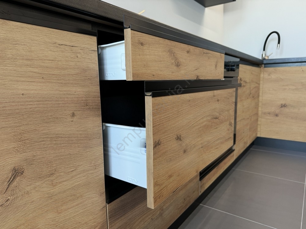 • Praktiškas virtuvės komplektas suteiks erdvią, funkcionaliai suskirstytą saugojimo erdvę ir vientisą darbo stalviršį.