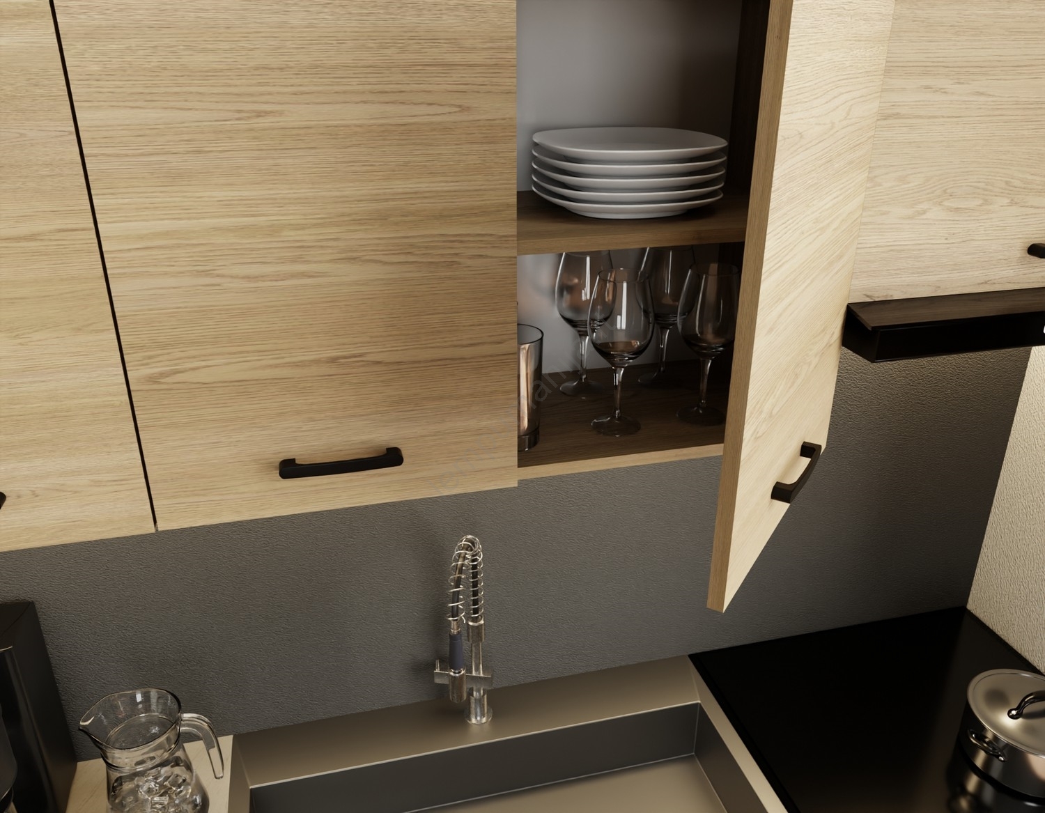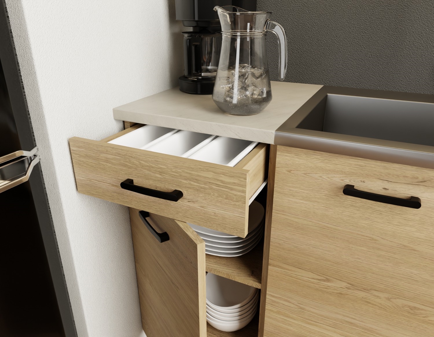 • Praktiškas virtuvės komplektas suteikia erdvias, patogiai suskirstytas saugojimo vietas.