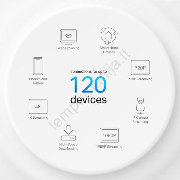 • Prijungimas daugiau įrenginių: OFDMA ir MU-MIMO technologijos padidina tinklo pajėgumą keturis kartus, leidžiant vienu metu perduoti duomenis keliems įrenginiams.