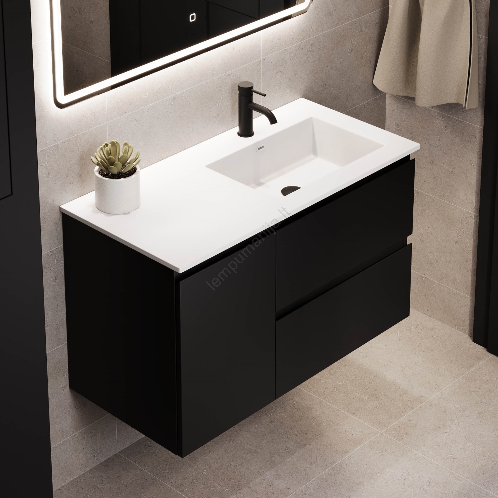 • Norėdami užbaigti bendrą įvaizdį, rekomenduojame derančią aukštą spintelę, kuri suteikia papildomos saugojimo vietos ir pabrėžia vientisą stilių.