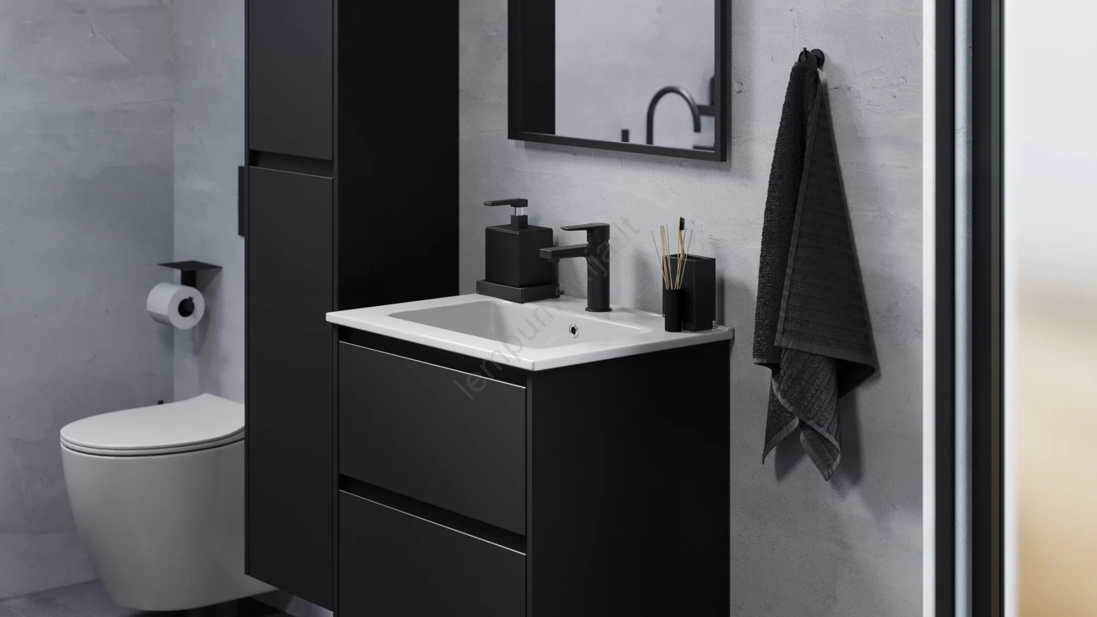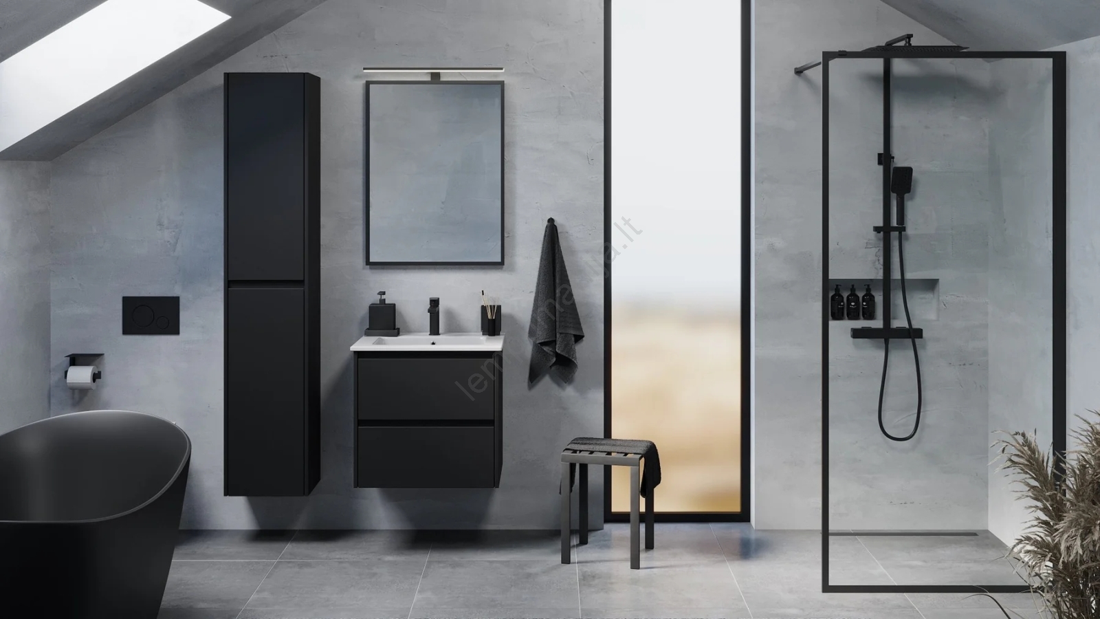 • Norint užbaigti bendrą vaizdą, rekomenduojame derančią aukštą spintelę, kuri suteikia papildomos vietos ir padeda sukurti vientisą stilių.