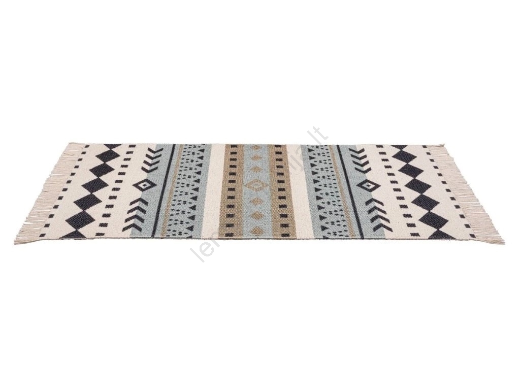 • Stilingas etno dizainas su geometriniais raštais mėlynos, smėlinės ir juodos spalvų derinyje.