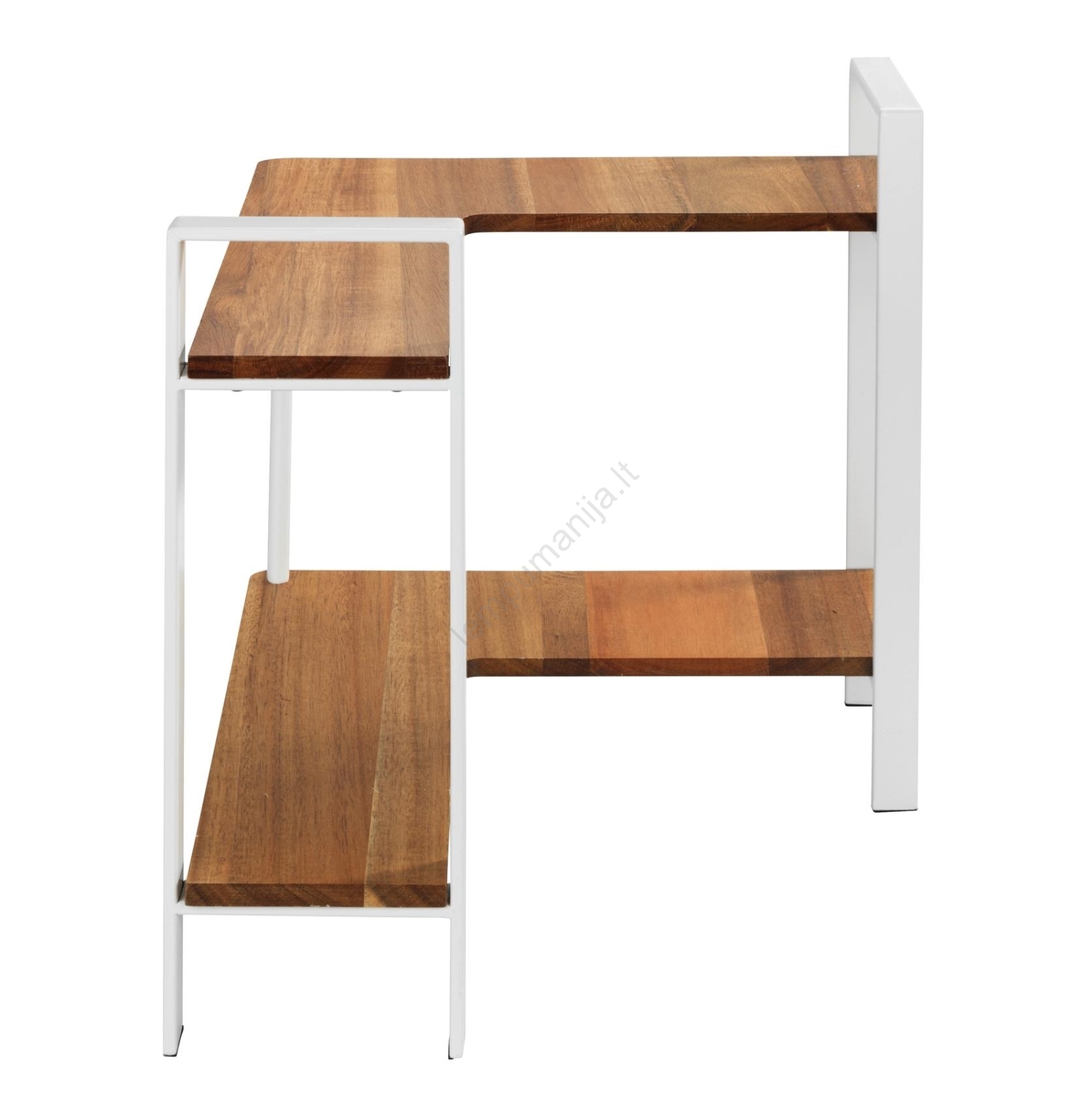 • Elegantiškas baltos metalinės rėmo ir akacijos medienos lentynų derinys.