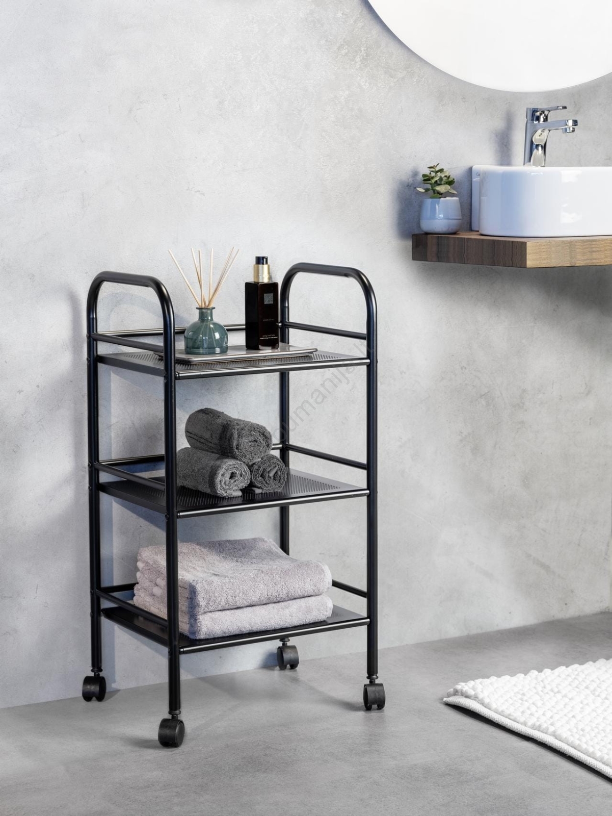 • Elegantiškas vonios vežimėlis su trimis lentynomis – patogiam daiktų išdėstymui.