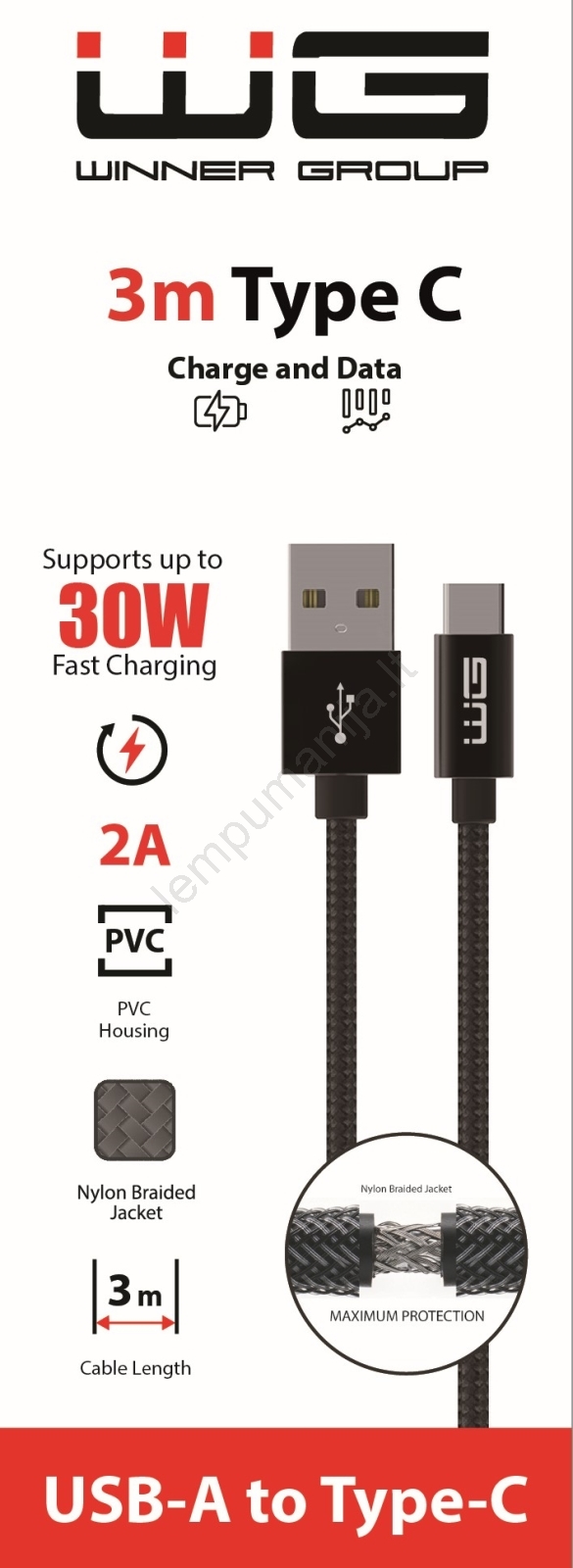 Winner Group - USB laidas USB-C / USB-A, 30 W, 3 m, juodas | Lempumanija