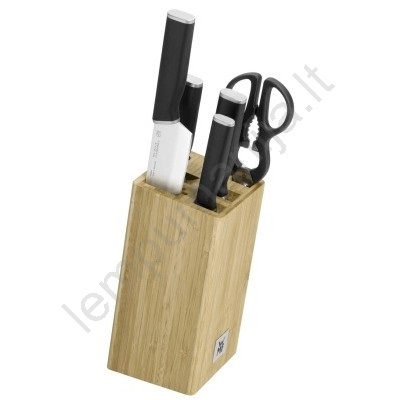 • Visas rinkinys iš 6 dalių: peilių blokas, šefinis peilis 20 cm, mėsos peilis 20 cm, duonos peilis 20 cm, daržovių peilis 9 cm ir virtuvinės žirklės.