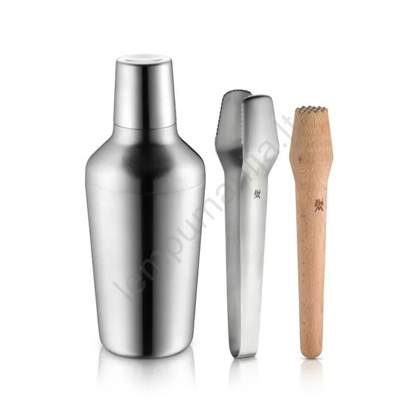 • Rinkinį sudaro kokteilių šejkeris su integruotu sieteliu, ledo žnyplės, išmanūs alkoholio matavimo indeliai ir mudleris žolelėms bei vaisiams trinti.